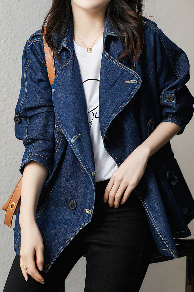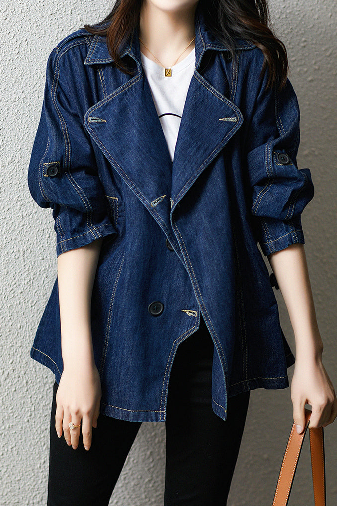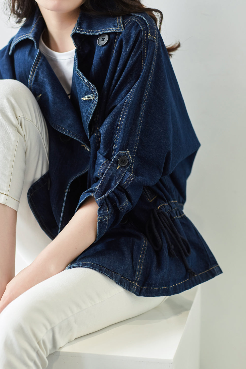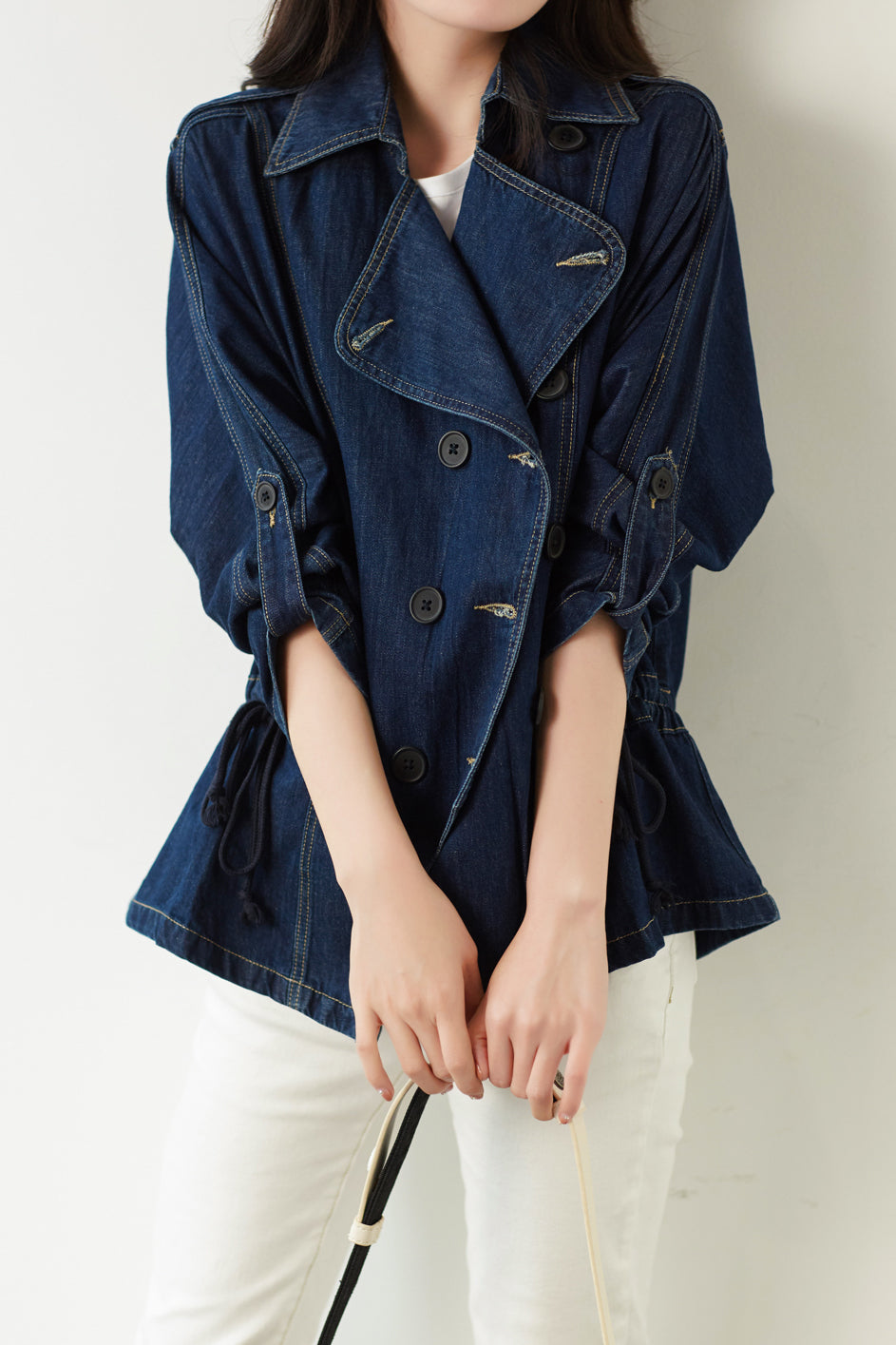 Feature:Long sleeves, denim, lapel collar, drawstring, double buttons, pockets, epaulets, gathered