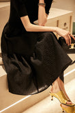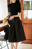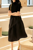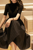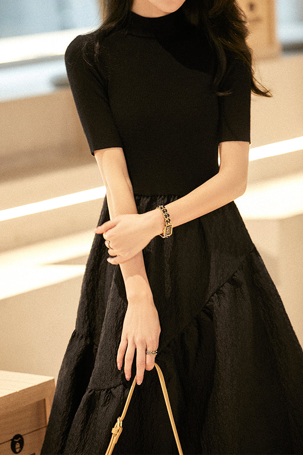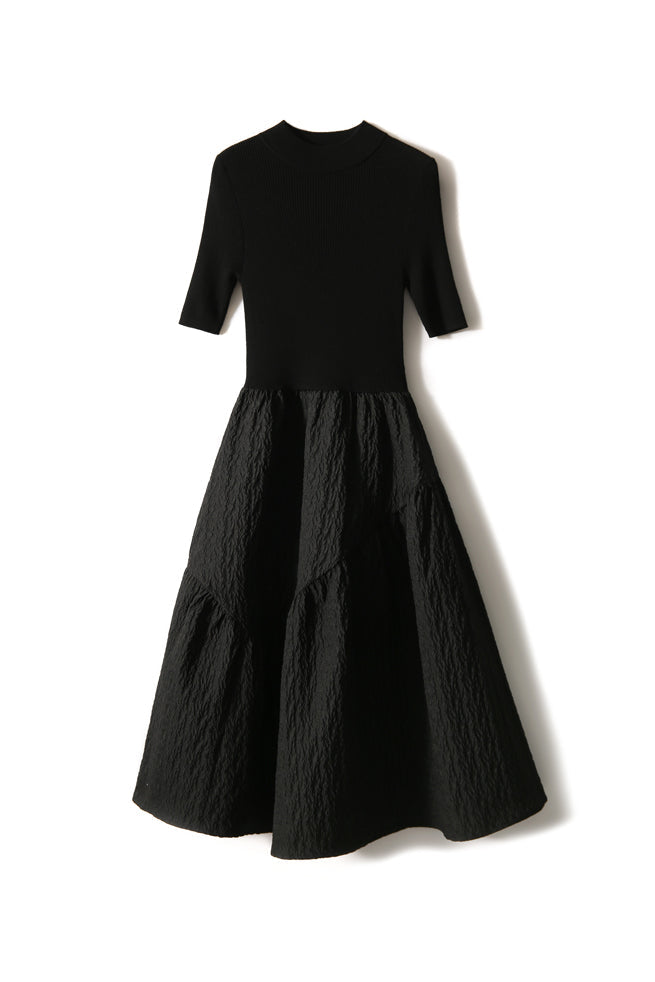Product details:Short sleeves, docking design, mock neck, embossed design, mixed materials, solid color, switch design, wide hem