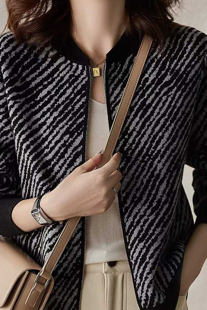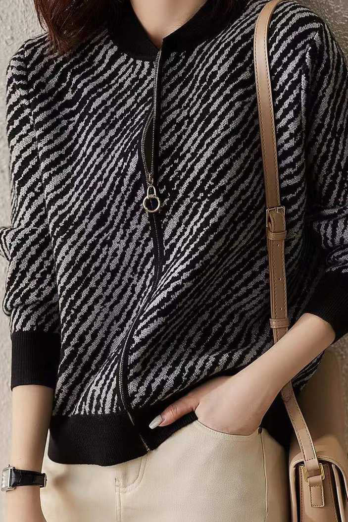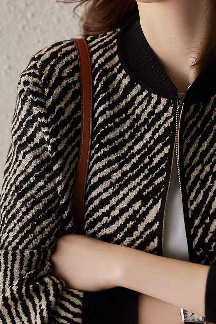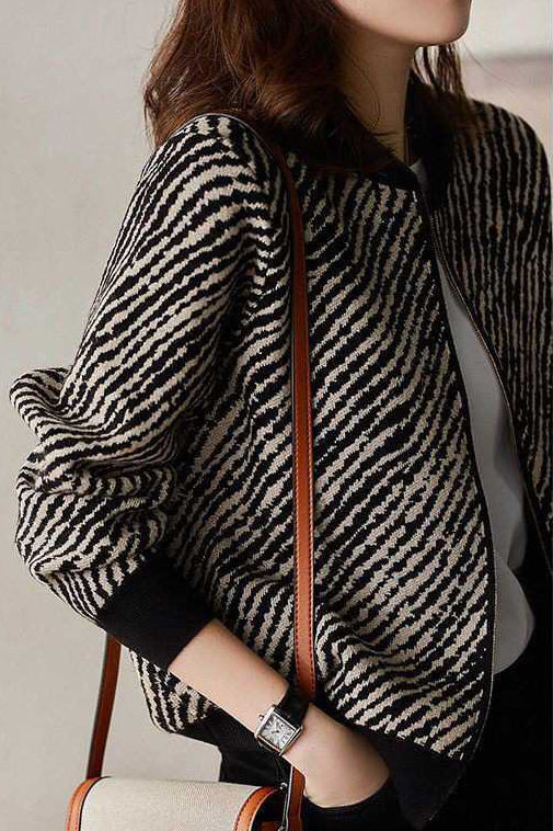 Feature:Baseball collar, ribbed hem, zebra stripe pattern, metallic zipper, long sleeves, front opening design