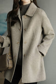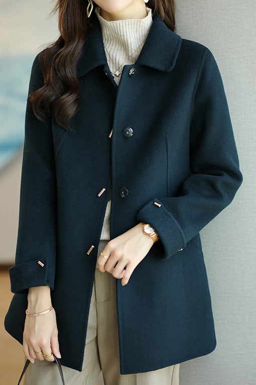 Product details:Stand collar, melton material, front button design, snap buttons, turn-up cuffs, double button decoration at cuffs, long sleeves, solid color