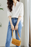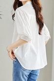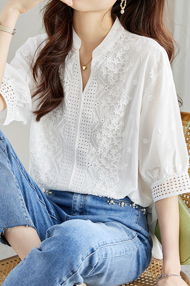 Skipper Collar Sheer Cutwork Flower Embroidered Blouse