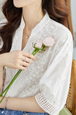 Feature:Skipper collar, sheer cutwork lace, flower embroidery, back gathered, short sleeves, all-over pattern, pullover