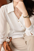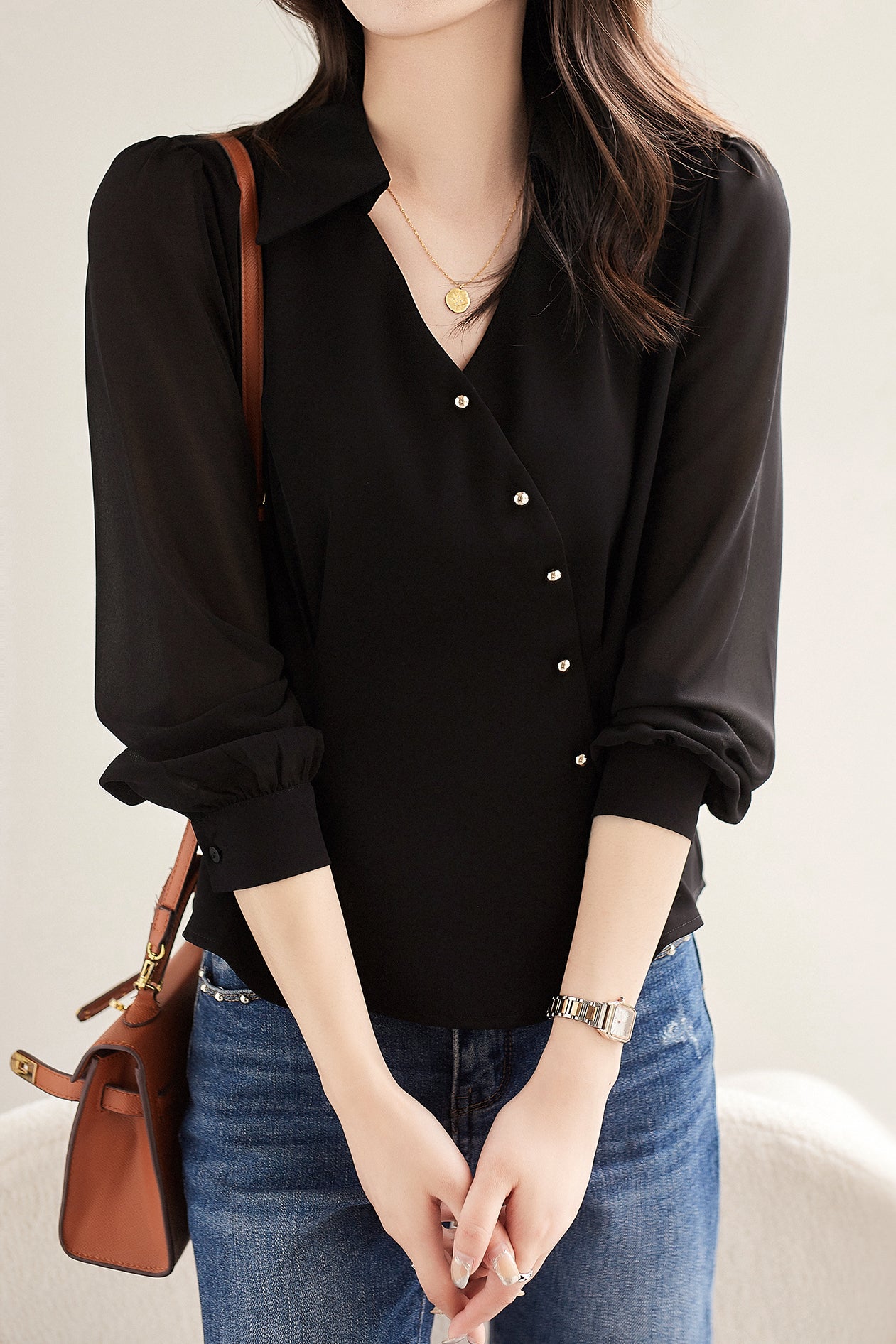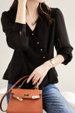 Feature:Skipper collar, satin material, mixed materials, switch design, front button opening, fitted, puff sleeves, long sleeves, solid color, elegant