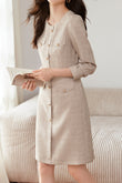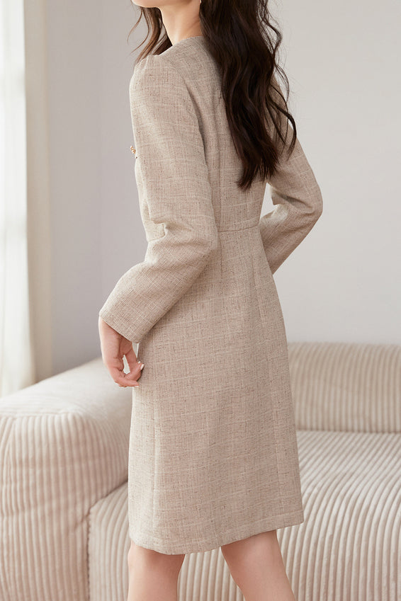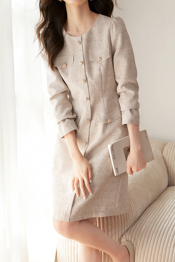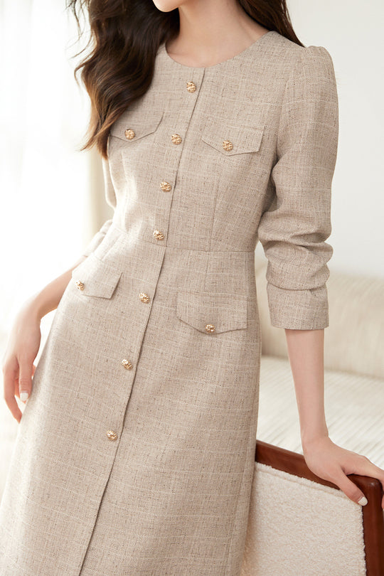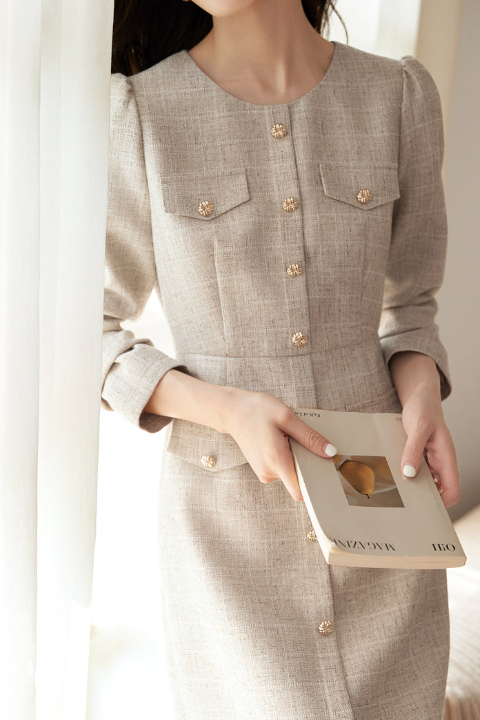 Feature: No collar, button decoration, flap pocket decoration, gathered detail at sleeve caps, with back concealed zipper, long sleeves, knee length, straight, solid color