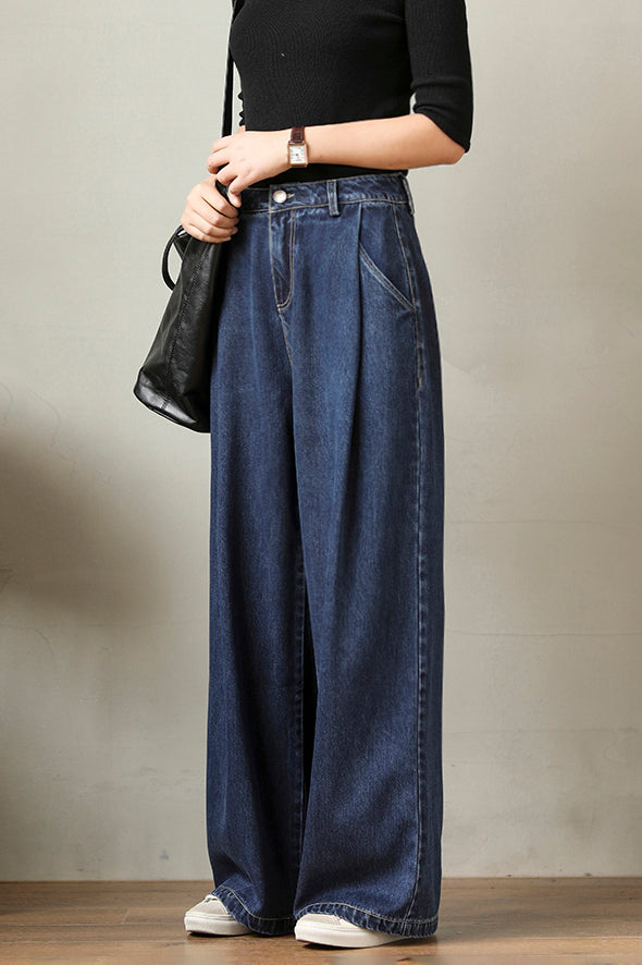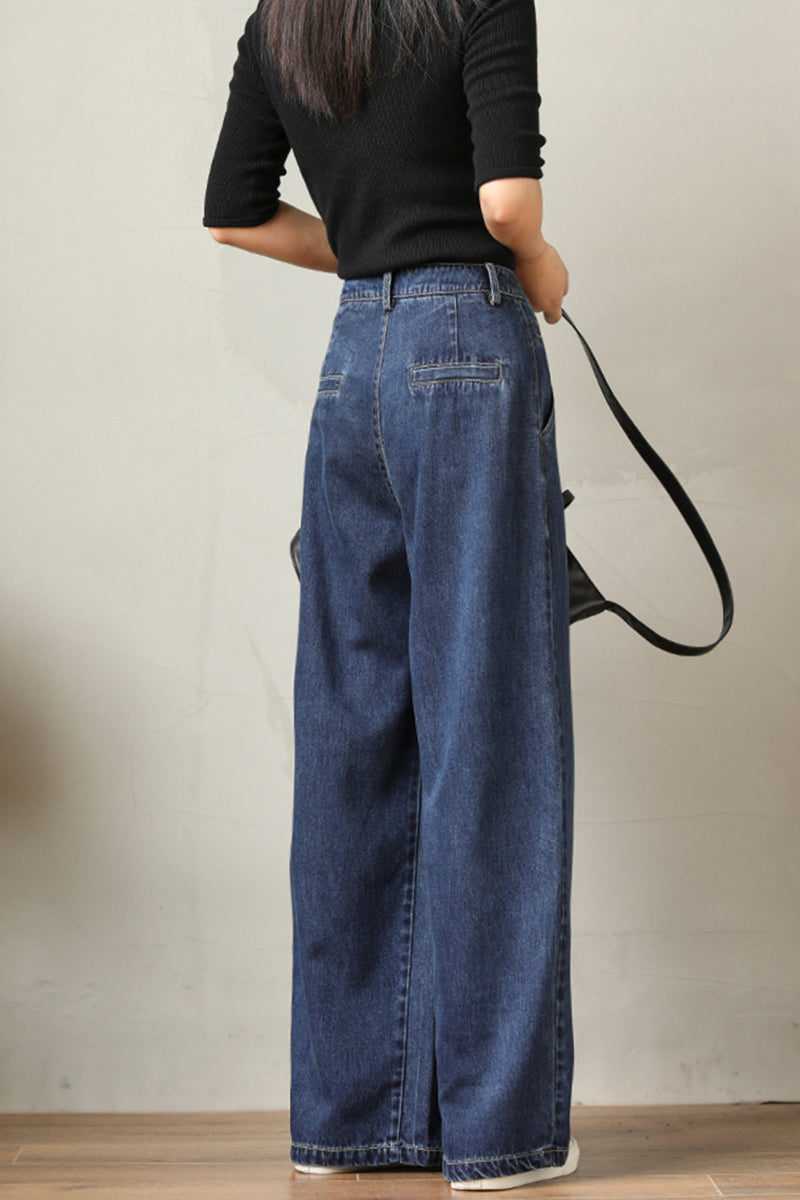 Front button opening, front zipper opening, denim material, tuck-in, with side pockets, with welt pockets at hips, wide silhouette, maxi length, solid color