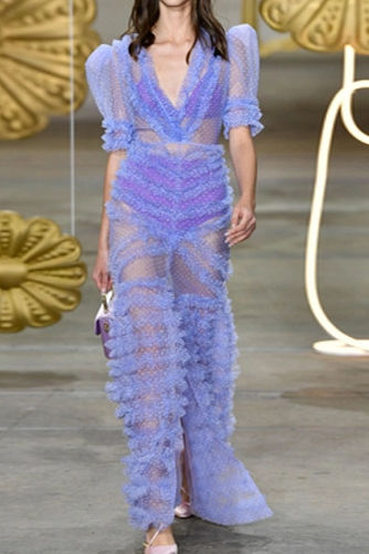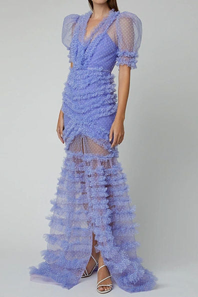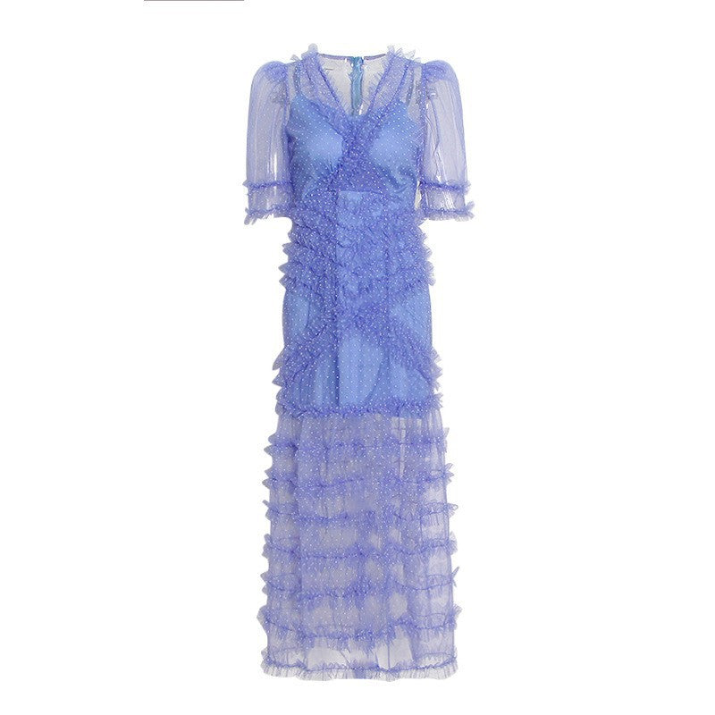Simple Style Elegant V-neck Bubble Short-sleeved High Waist Slim-fit Mesh Dress