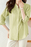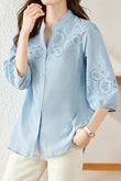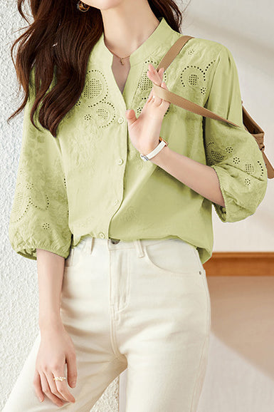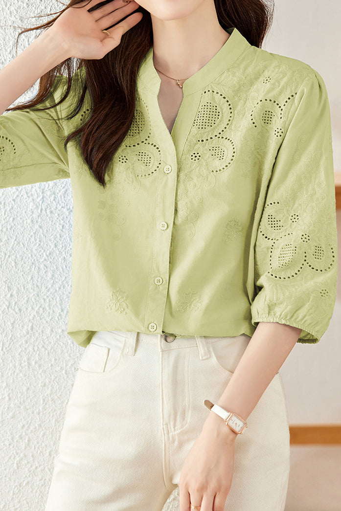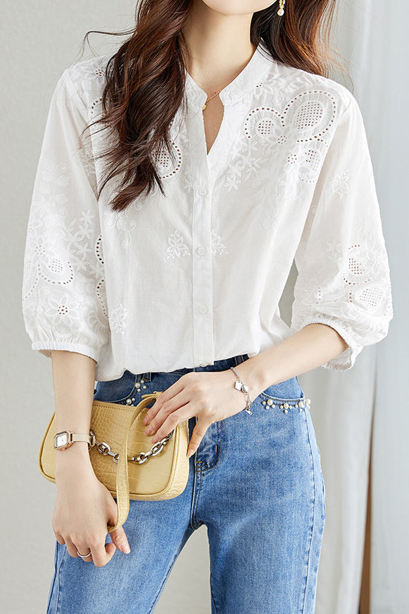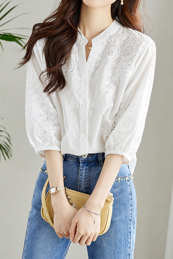 Product details:Shirt, embroidery design, hollow design, single-row detachable buttons at the front placket, elastic cuffs, curved hem