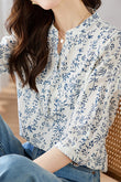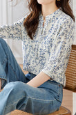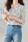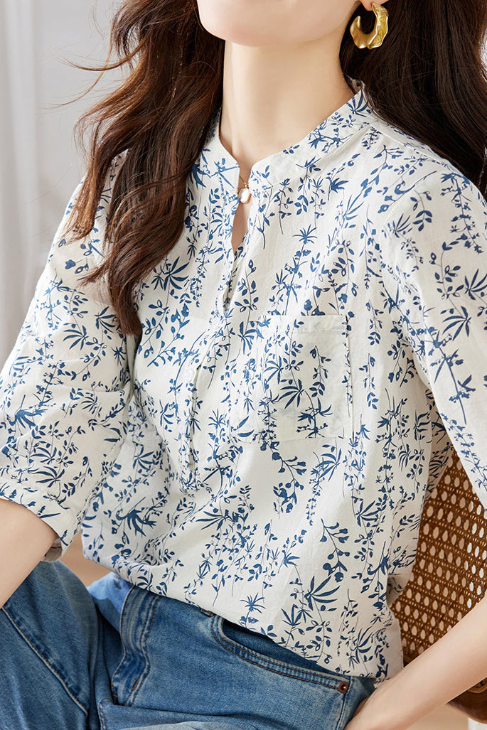 Product details: Shirt, with floral patterns, single - row detachable buttons at the collar. The three - quarter sleeves have detachable buttons, and there is a patch pocket on the chest.