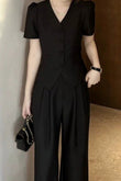 Product details: Set, V-Neck, Single Button Closure on Left with Right Flap, Decorative Faux Pockets at Waist