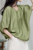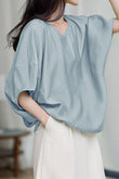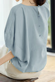 Product details: Solid Color Textured Drop Shoulder Bat Sleeve Shirt,Round Neck,Button Detail at Back