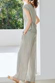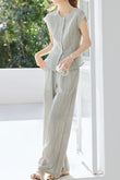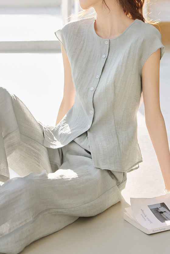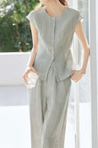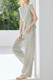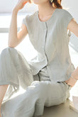 Product details:Round neck sleeveless top and long pants set, sleeveless open front, functional buttons, back tie design, loose straight leg pants with elastic waistband, front pockets, half lining