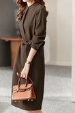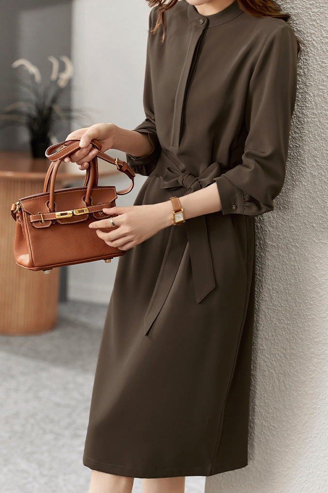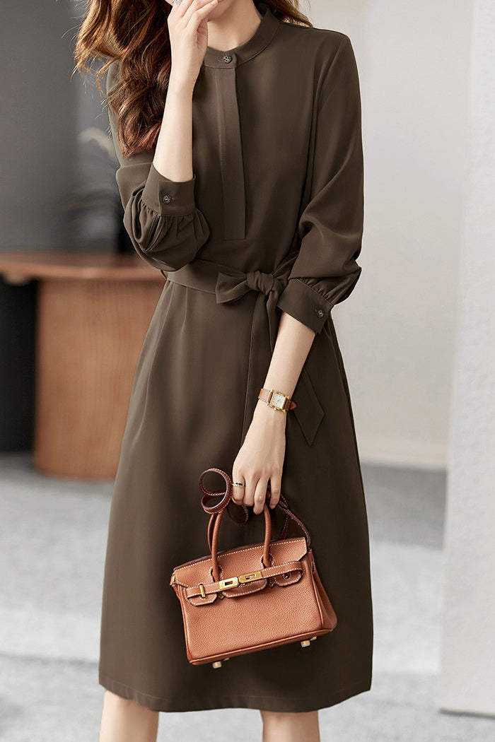 Product details:Dress, solid color, stand-collar with half-placket, detachable buttons at front neck, hidden buttons on front placket, waist with removable bow tie strap, side pockets